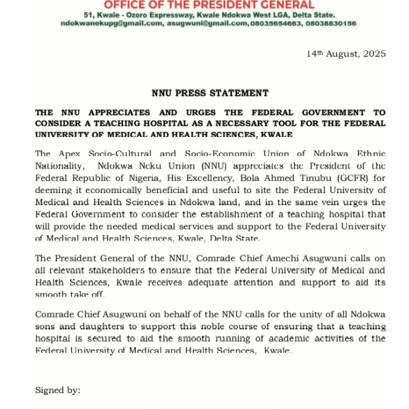 The President General of Ndokwa Neku Union (NNU), Comrade (Chief) Amechi Asugwuni, has appealed to the Federal Government to complement...