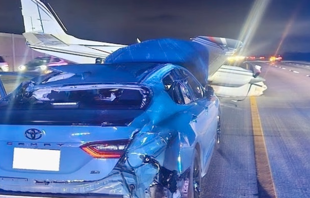 In the process of descending onto the busy highway, the aircraft collided with a Toyota Camry driven by an elderly woman. She was transported to a nearby hospital with minor injuries.